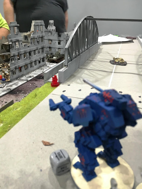 In the event, we had Japanese, American, and German Bolt Action lists, and Canadian and German Konflikt '47 lists. Since we had three German players, the Japanese became honorary allies for the fight, so we had a 3 vs. 3 game. The board utilized Wayne's gorgeous Arnhem bridge surrounded by more of his beautiful ruined buildings. We divided the board into six zones and rolled randomly to assign starting zones, while the goal was to control each end of the bridge.